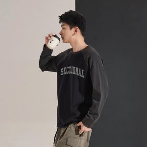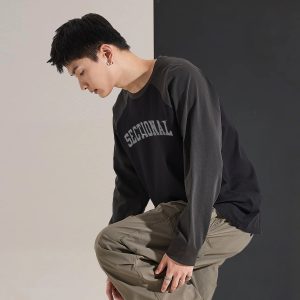 Long-sleeved T-shirt Men’s Autumn Men’s Long-sleeved T-shirt Top Men’s Round Neck Front Chest Text Printed Raglan Sleeve T-shirt