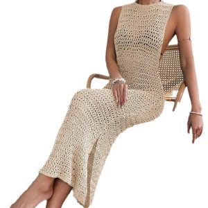 Side beach dress European and American hollow knitted long skirt suspender backless sexy dress